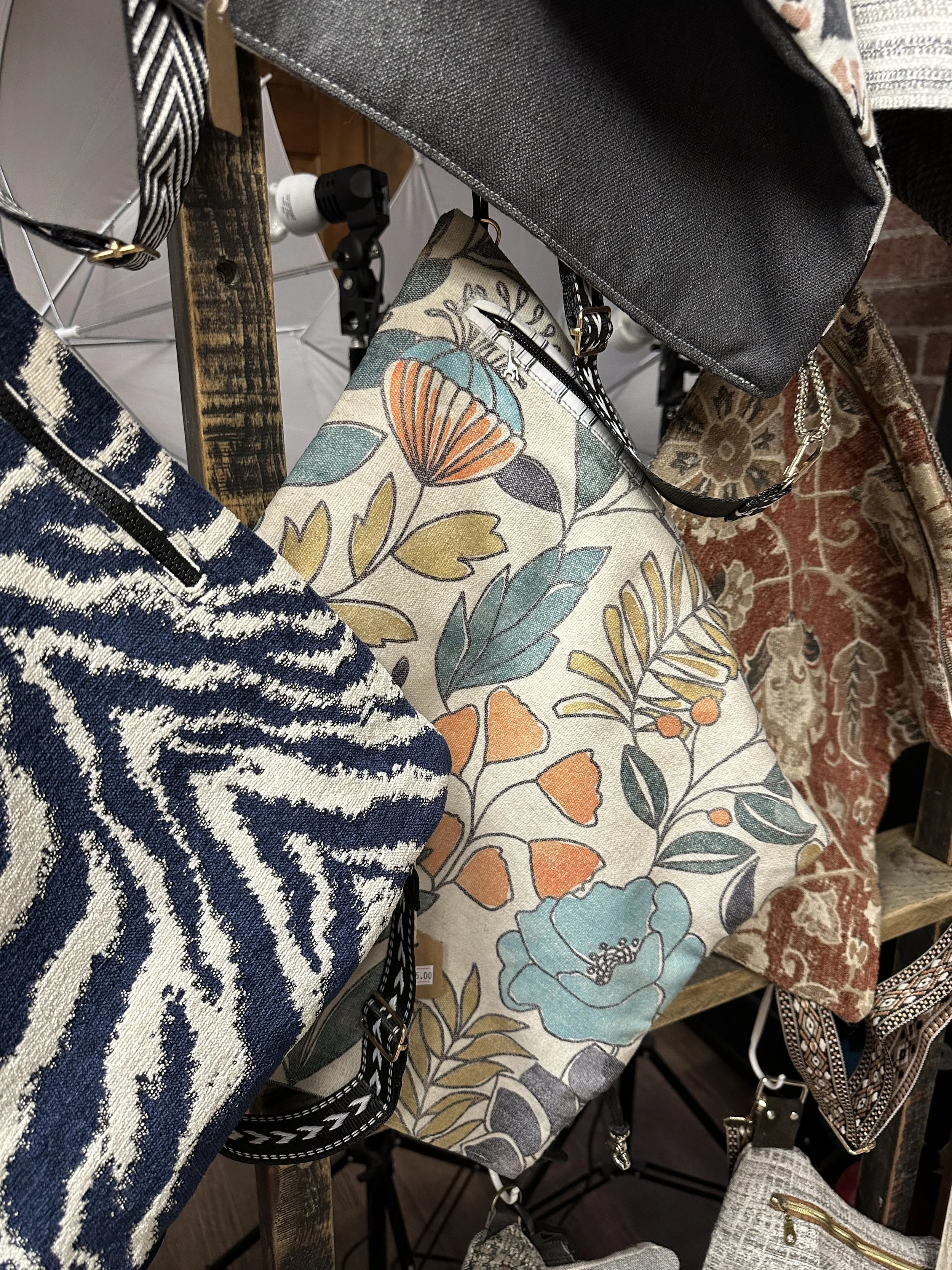 Custom made bags from remnant upholstery fabrics. Each bag is unique and one of a kind.